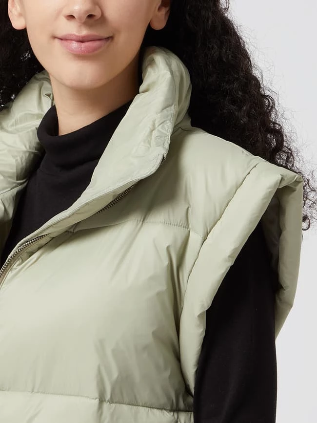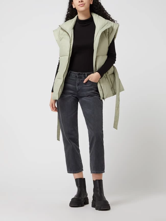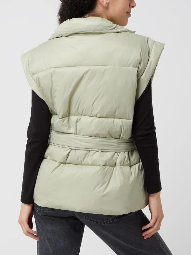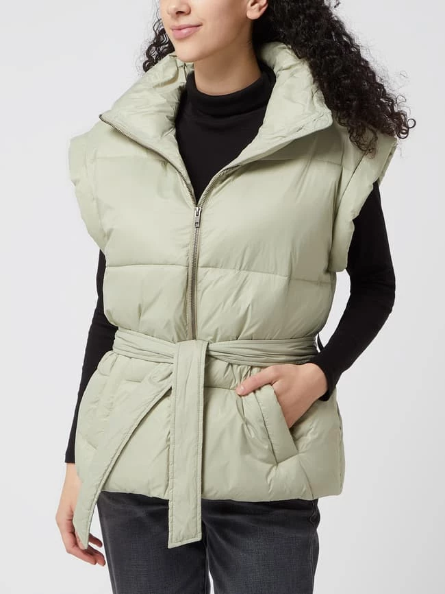 Die Steppweste von Modström ist aus strapazierfähigem Material gefertigt und gerade geschnitten. Sie kommt mit Stehkragen, Eingrifftaschen und Taillengürtel zum Binden.