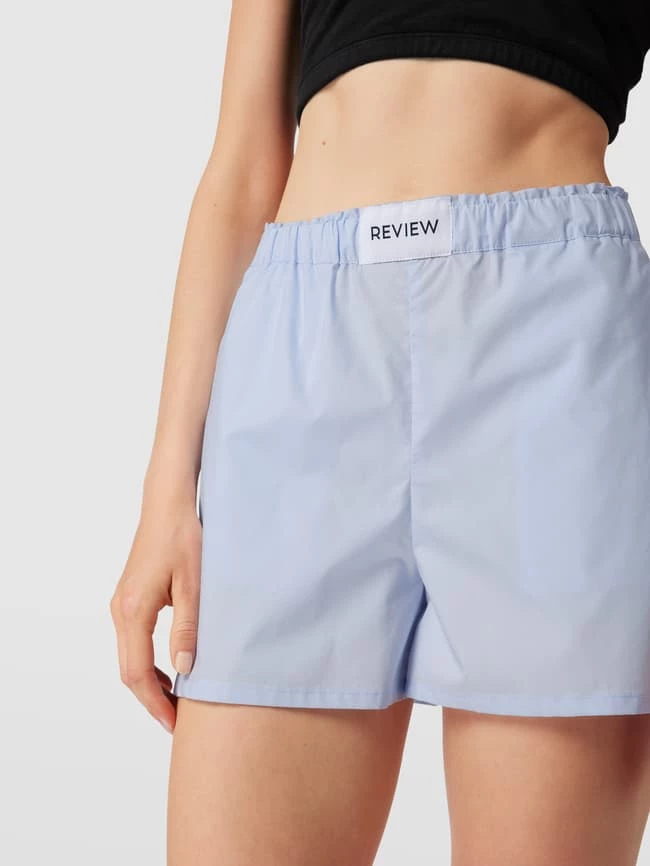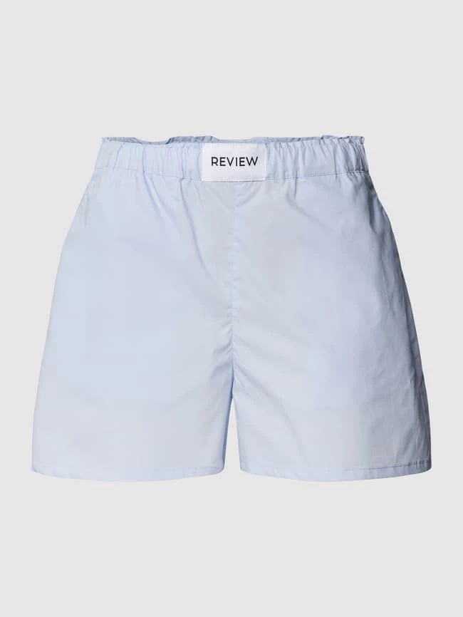 Die Shorts von REVIEW ist aus reiner Baumwolle gefertigt und körpernah geschnitten. Sie zeigt sich mit Eingrifftaschen und Label-Detail sowie Streifenmuster und elastischem Bund.